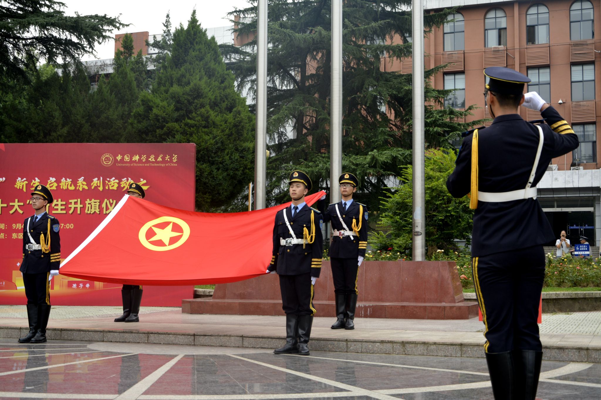 清晨七时,伴随一声洪亮的口号“出旗”,由新生组成的仪仗队迈着坚定有力的步伐,整齐划一地护卫着鲜艳的国旗和中国科学院院旗、中国科大校旗迈向升旗台。伴随着庄严的国歌和校歌,旗帜冉冉升起,迎风飘扬。