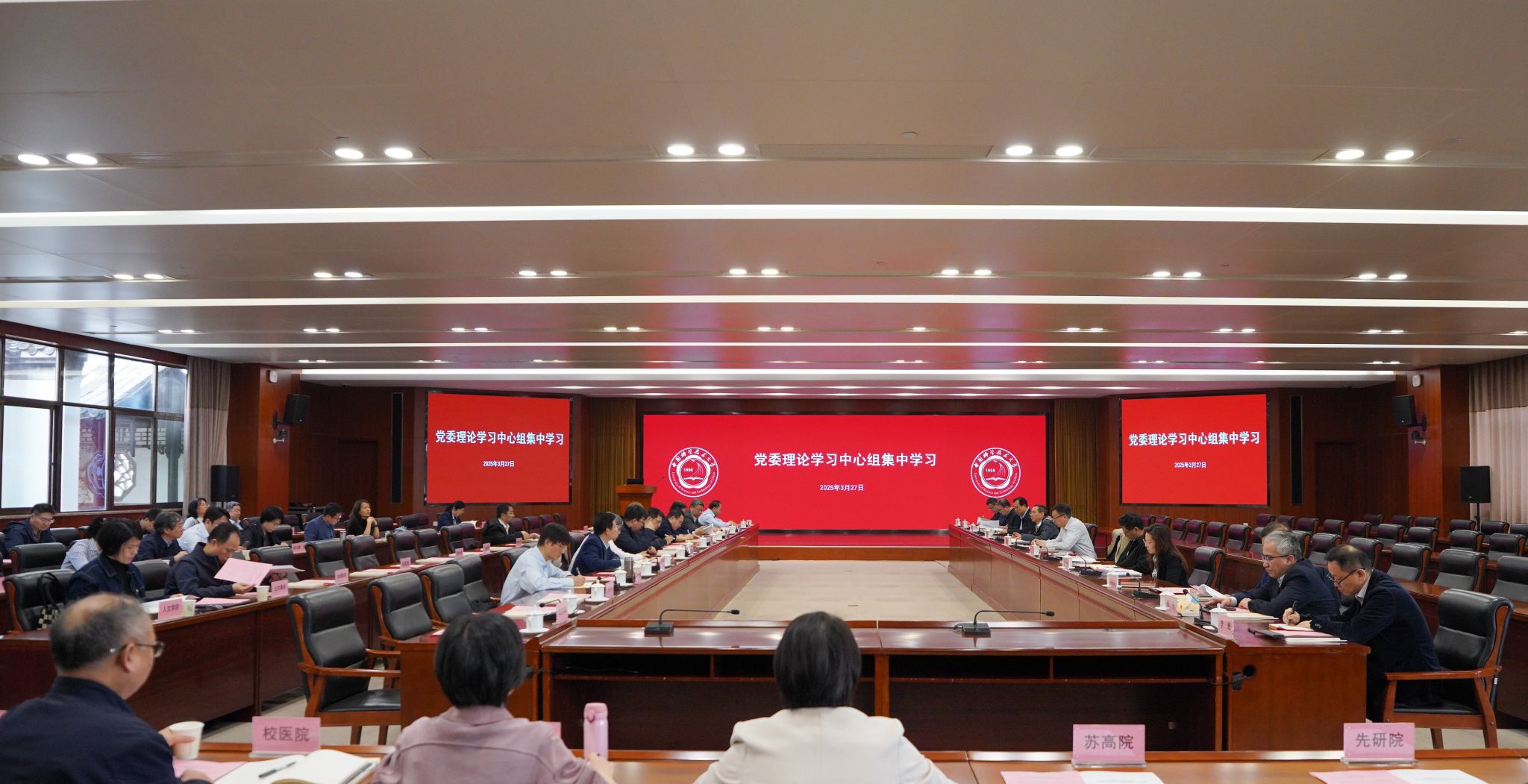 3月27日上午,校党委理论学习中心组2025年度第五次集中学习会暨深入贯彻中央八项规定精神学习教育读书班开班式在东活五楼报告厅举行。校党委书记舒歌群主持会议并讲话,校长常进作书面发言。在校校领导,党委委员、纪委委员,机关党群部门主要负责人,院级党组织书记参加会议。