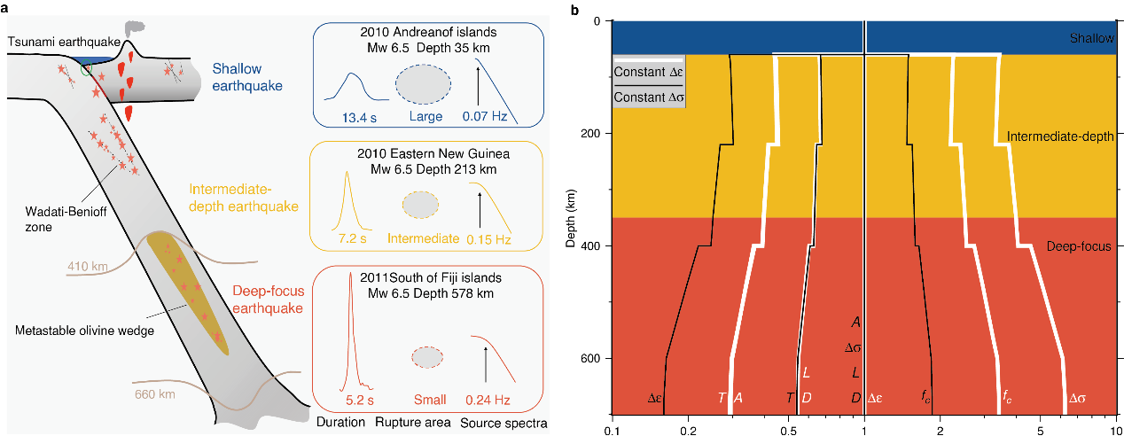深地震是指震源深度超过60公里的地震。由于地球深处高温高压,岩石表现出塑性形变,深地震的产生机制与浅地震的脆性破裂有所不同。关于深地震成因有许多猜想,如脱水脆化、热失稳和亚稳态橄榄石相变等,但至今仍没有定论。了解深地震的成因和破裂过程有助于我们更好地理解地震的物理机制、俯冲带的性质以及地球内部的动力过程。长久以来,地震学家通过分析震源时间函数,发现浅地震(0-60 km)、中源地震(60-300 km)和深源地震(300-700 km)具有不同的破裂特征,并根据这些差异推断深地震可能的产生机制。