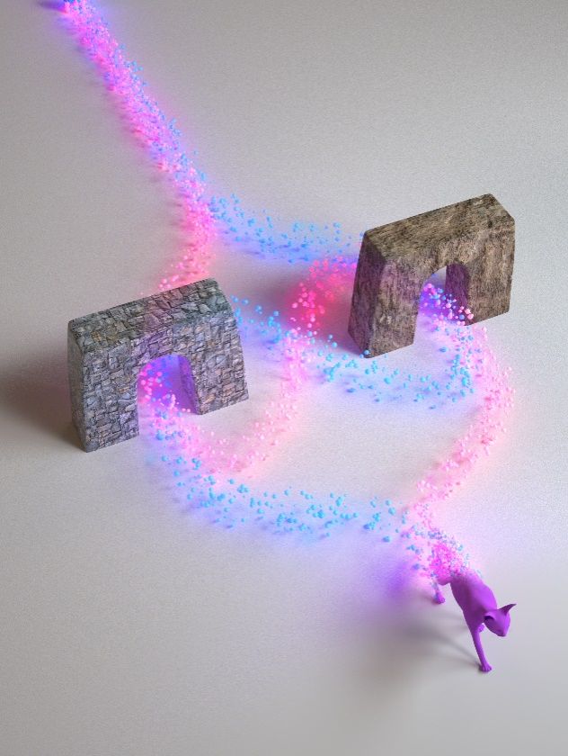 图1:量子不确定因果序的示意图。蓝色和红色路线经过两个门的时序不同且处于量子叠加态。