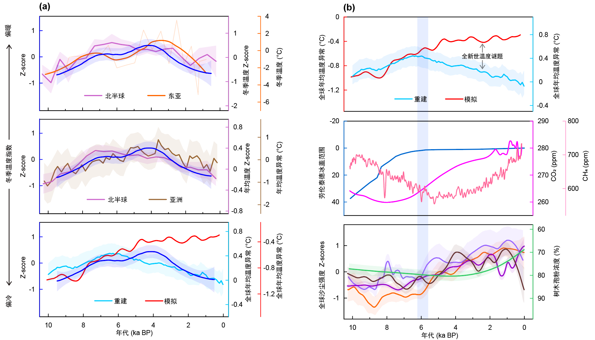 图1(a)东亚及全球全新世温度重建记录和(b)全新世温度谜题及其各类驱动因子序列