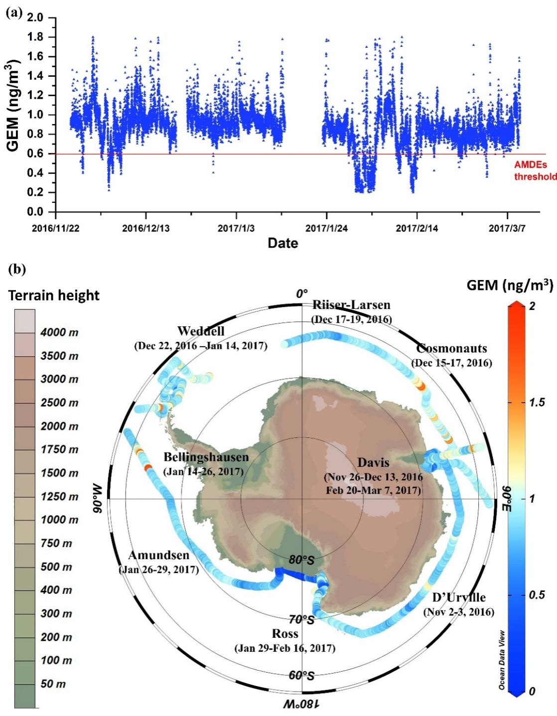 图 中国第33次南极科考期间大气零价汞浓度的时间序列(a)及环南极空间分布图(b)